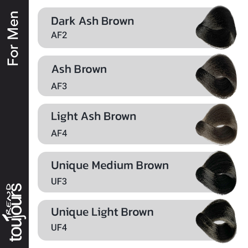 تناژ رنگ | Dark Ash Brown AF2, Ash BrownAF3, Light Ash Brown AF4, Unique Mediuom Brown UF3, Unique Light Broown UF |